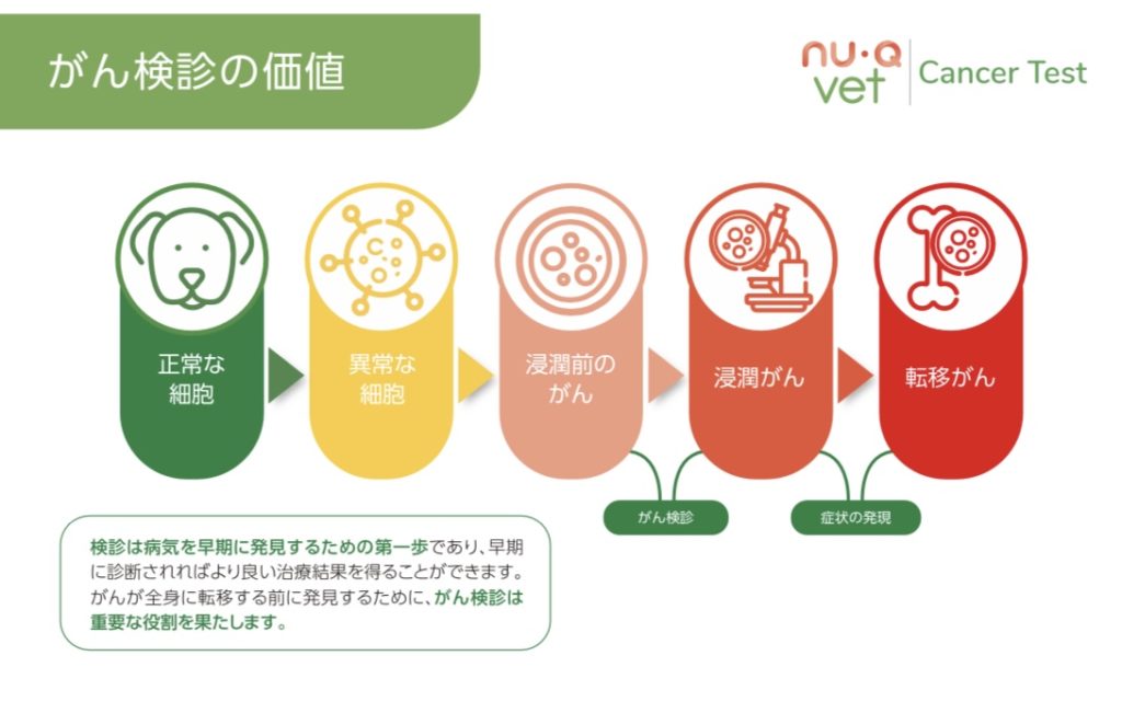 Nu.Q Vet Cancer Testとは細胞が壊れると放出される物質の血中濃度を測定し、がんに罹患しているリスクを判定するもので世界各国で実施されている検査です。
